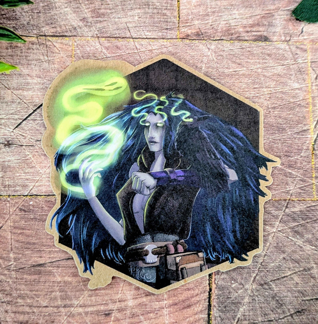 Cet autocollant en kraft mesure 8 x 8 cm. Il représente une nécromancienne avec son corbeau.