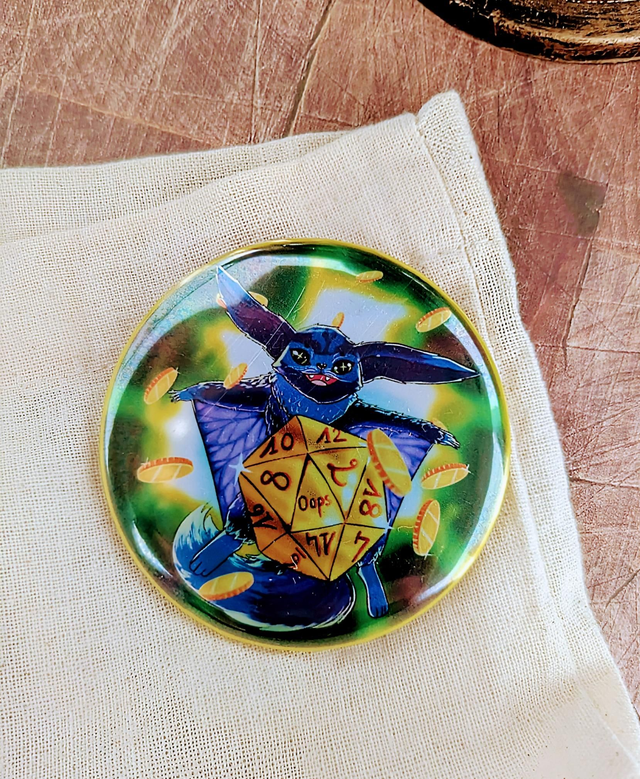 Grand badge avec dos en plastique peint en violet métallique de 58mm de diamètre. Ce badge artisanal représente une petite créature de mon univers : un sinumura, ainsi que son butin : des pièces d'or et un dé or "Oops". Imprimé sur du papier holographique et donne un aspect métallisé.
