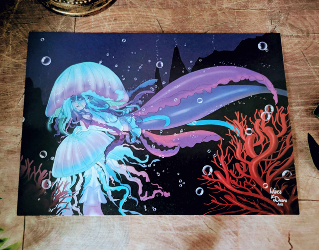 Illustration représentant ma sirène "Asdume" entourée de ses amies méduses, imprimée sur du papier recyclé 250g de taille 14,8 x 21 cm.