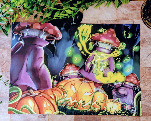 Illustration représentant des Faelines avec un curieux artéfact, ainsi que des citrouilles étranges. Imprimée sur du papier recyclé de 250g de taille 21 x 29,7 cm.