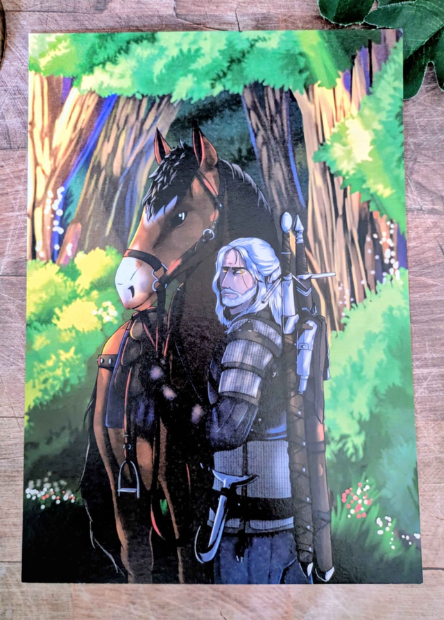 Illustration représentant le célèbre chasseur de monstre Géralt de Riv et sa fidèle monture Ablette, imprimée sur du papier recyclé 250g de taille 14,8 x 21 cm.