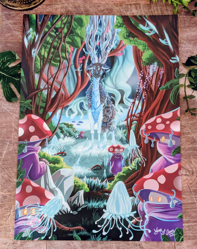 Illustration représentant une curieuse créature dans la forêt des âmes. Imprimée sur du papier recyclé de 250g de taille 21 x 29,7 cm.