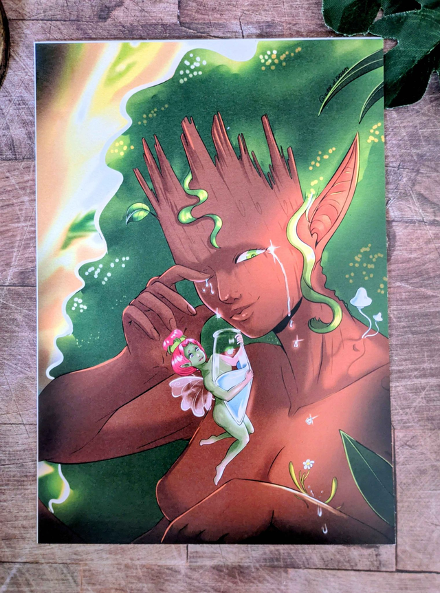 Illustration représentant Fa'Ry qui donne des larmes à une fée. Imprimée sur du papier recyclé 250g de taille 14,8 x 21 cm.