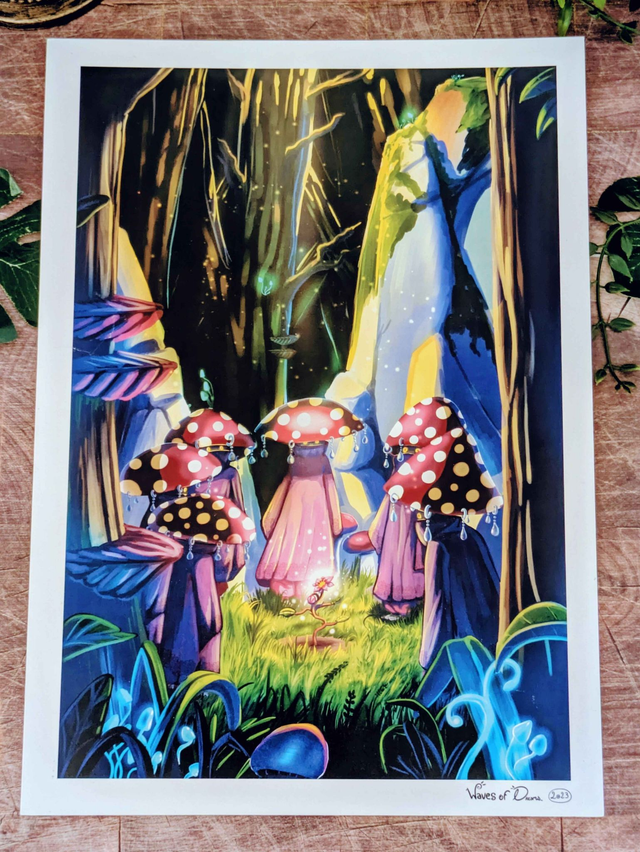 Illustration représentant des Faelines en pleine assemblée, imprimée sur du papier recyclé de 250g de taille 21 x 29,7 cm.