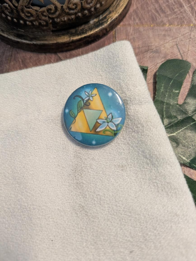 Mini Badge avec dos fer blanc représentant la Triforce de "The legend of Zelda" avec une fleur de la sérénité. Fait artisanalement.